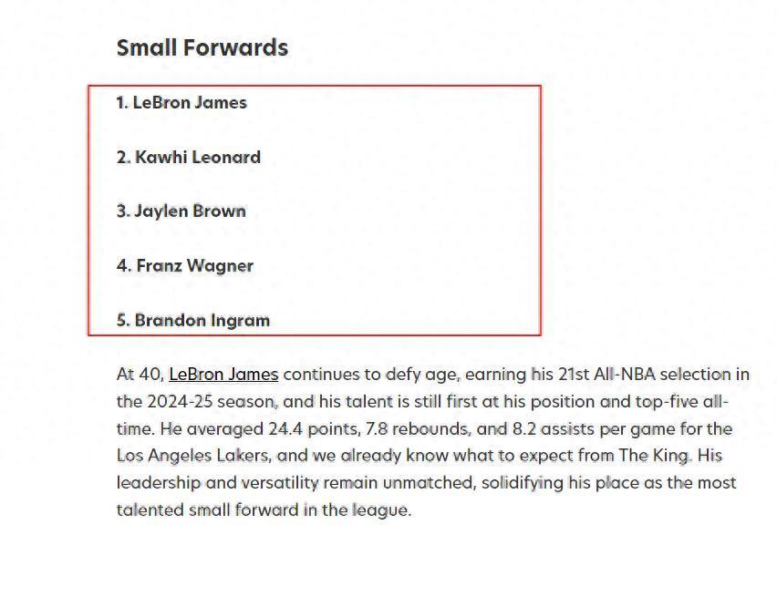 休赛期连新闻都很少,媒体自然绞尽脑汁,也是评选了现役五大小前锋球员,当然除了如今的实力,另一个评判标准,是球员的天赋高低。于是詹姆斯力压伦纳德领跑,杰伦-布朗和小瓦格纳紧随其后,昔日湖人榜眼英格拉姆排在第五。